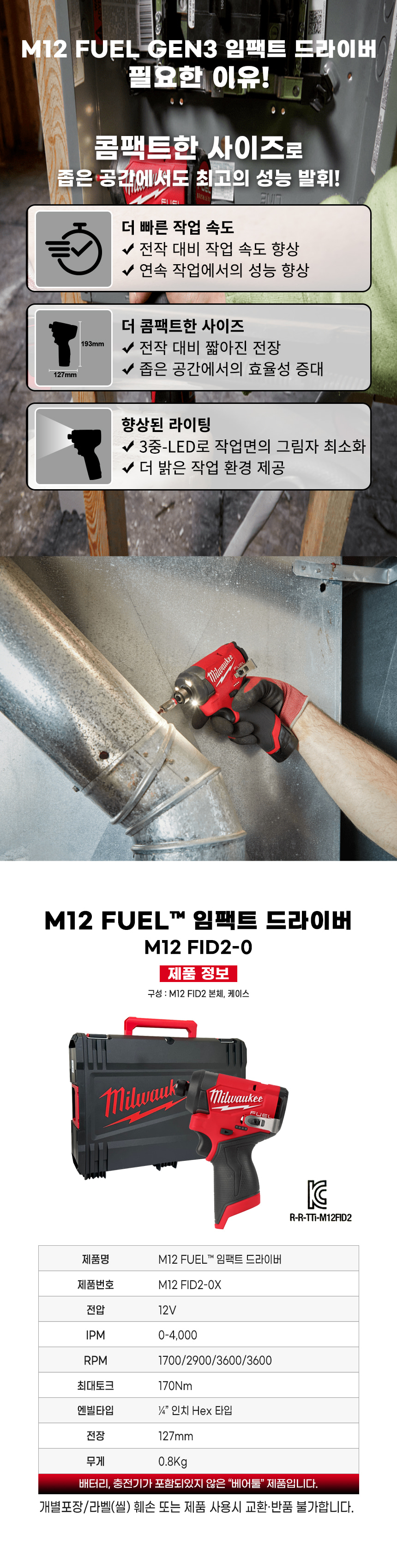 밀워키 12V FUEL 충전 임팩트 드라이버 베어툴 M12 FID2-0X