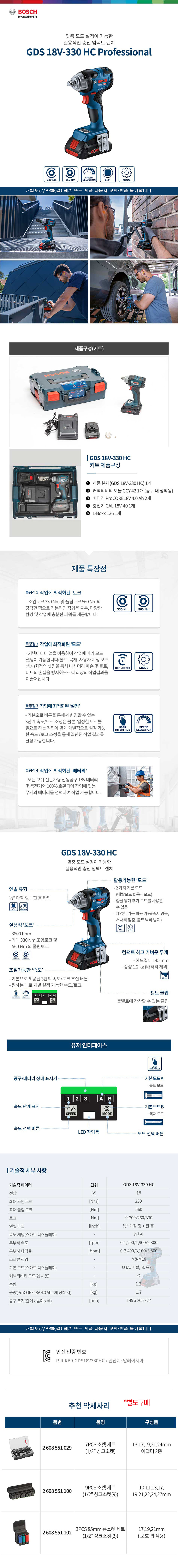 보쉬 GDS 18V-330 HC 충전 임팩트 렌치 세트 06019L50B1