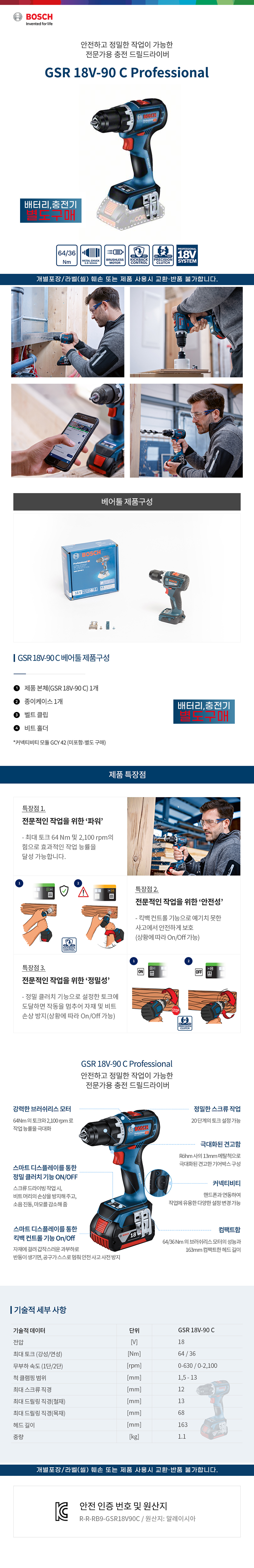 보쉬 GSR 18V-90 C 충전 드릴 드라이버 베어툴 06019K60B1