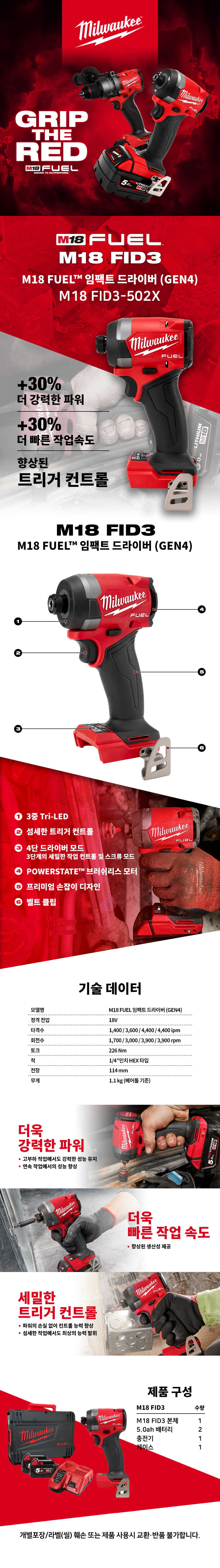 밀워키 18V 5.0AH FUEL 충전 임팩트 드라이버 GEN4 M18 FID3-502X 배터리 세트
