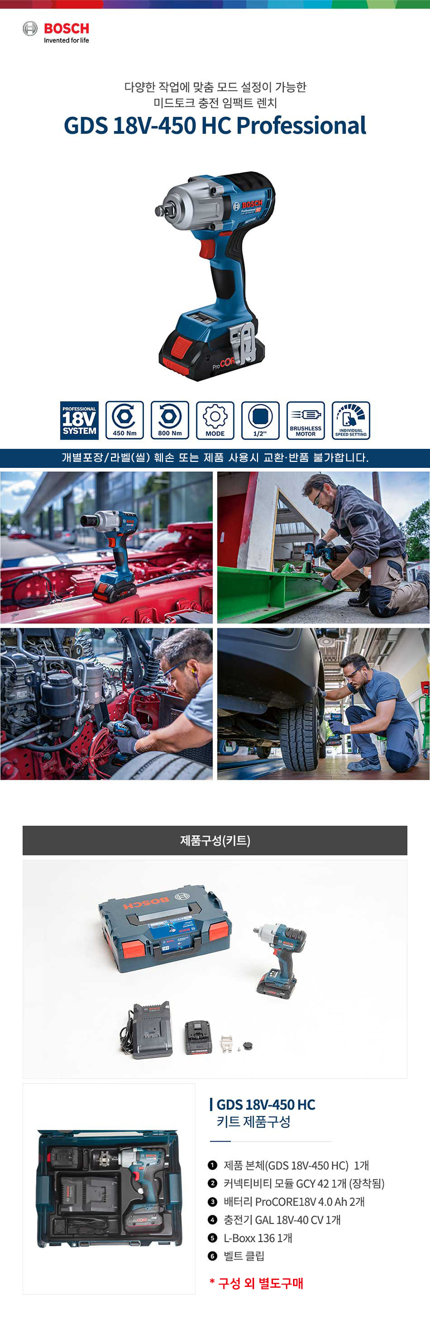 보쉬 GDS 18V-450 HC 미드토크 충전 임팩트 렌치 배터리 세트 06019K40B1