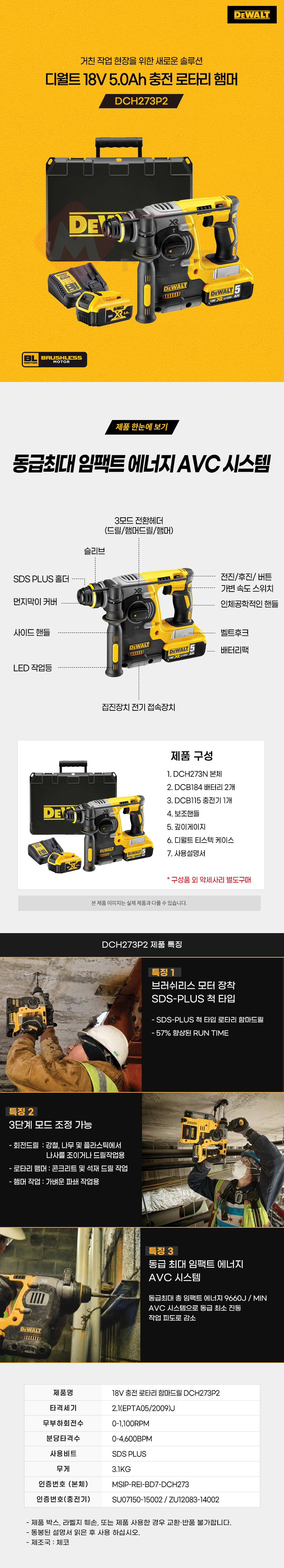 디월트 DCH273P2 충전 브러쉬리스 로타리 햄머 전동 함마 드릴 18V 5.0Ah