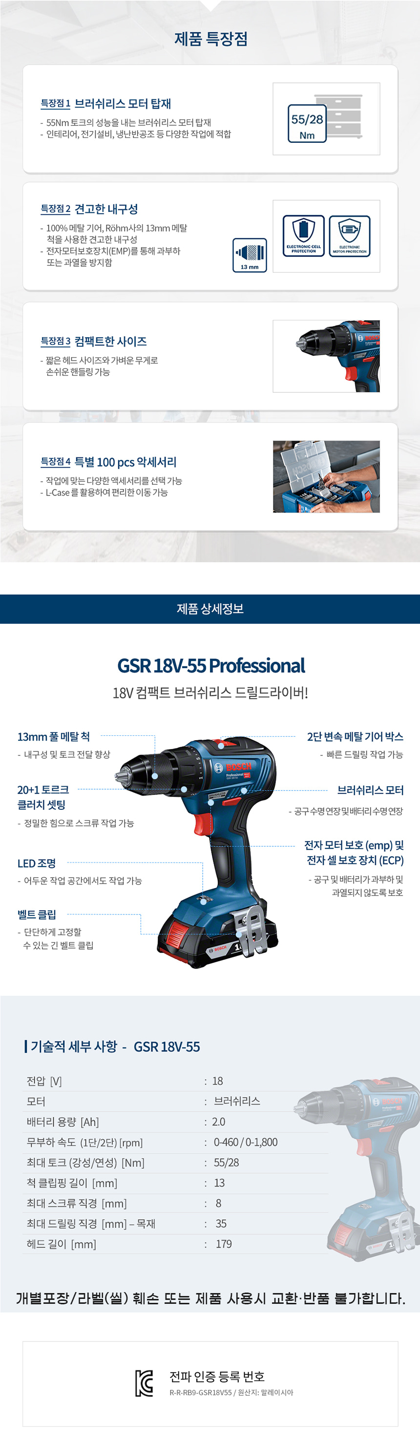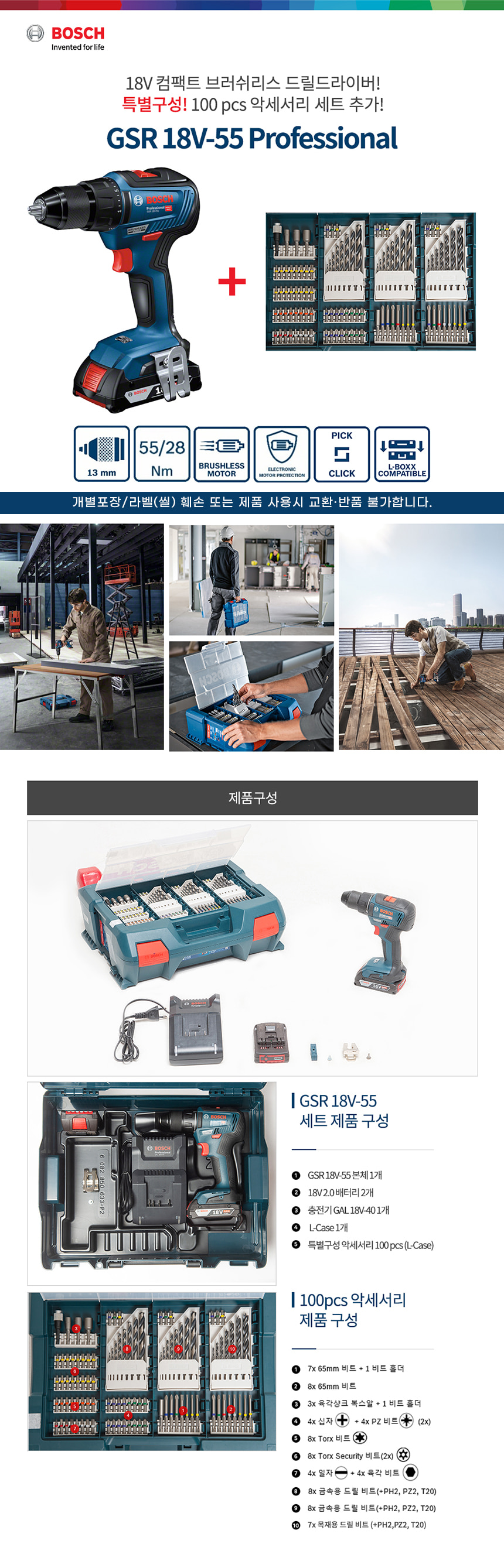 보쉬 GSR 18V-55 충전 드릴 드라이버 배터리 비트 악세서리 세트 06019H52B3