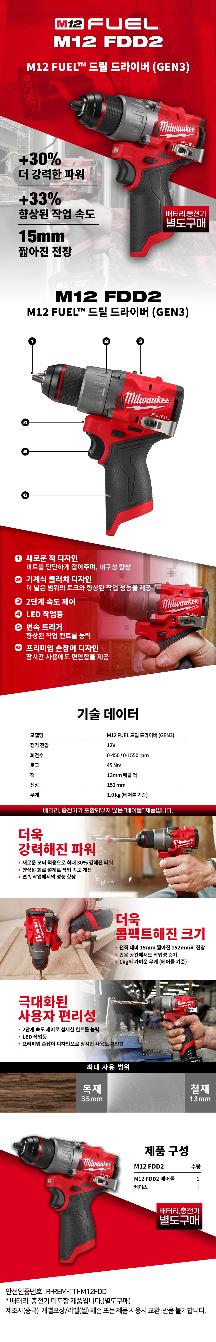 밀워키 12V FUEL 충전 드릴 드라이버 베어툴 M12 FDD2-0X