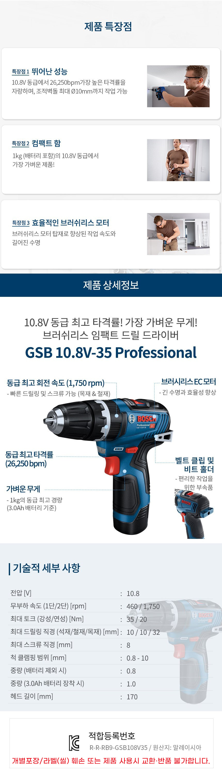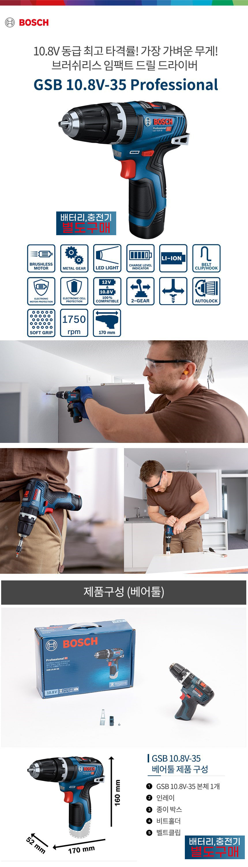 보쉬 GSB 10.8V-35 브러쉬리스 임팩트 드릴 드라이버 베어툴 06019J90B0