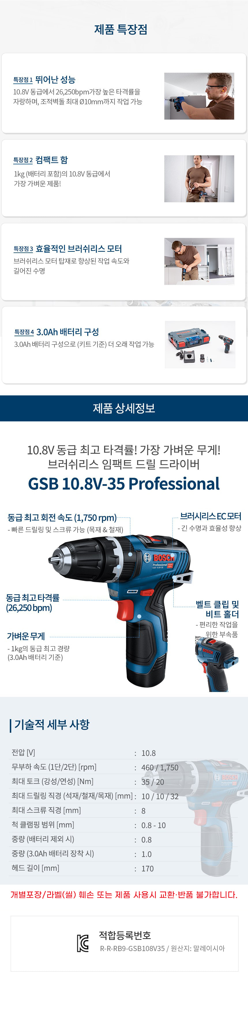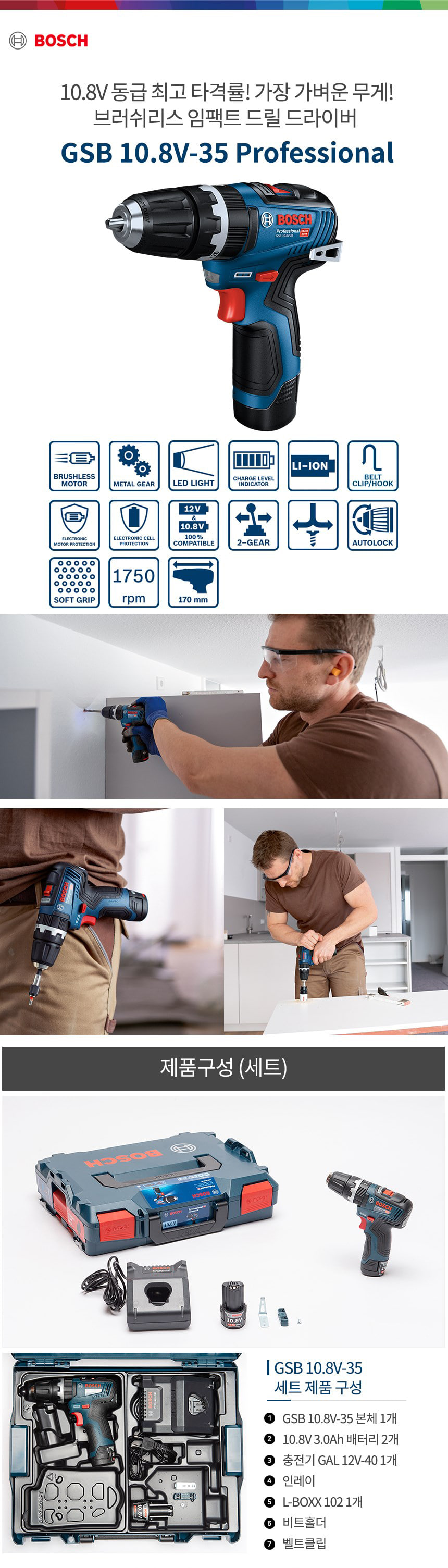 보쉬 GSB 10.8V-35 브러쉬리스 임팩트 드릴 드라이버 배터리 세트 06019J90B1
