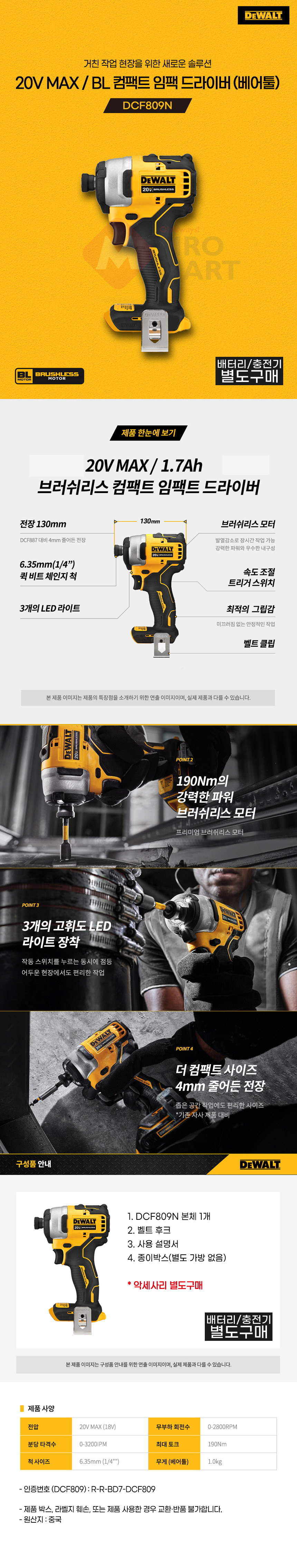 디월트 DCF809N 충전 브러쉬리스 컴팩트 임팩트 드라이버 베어툴 20V 18V