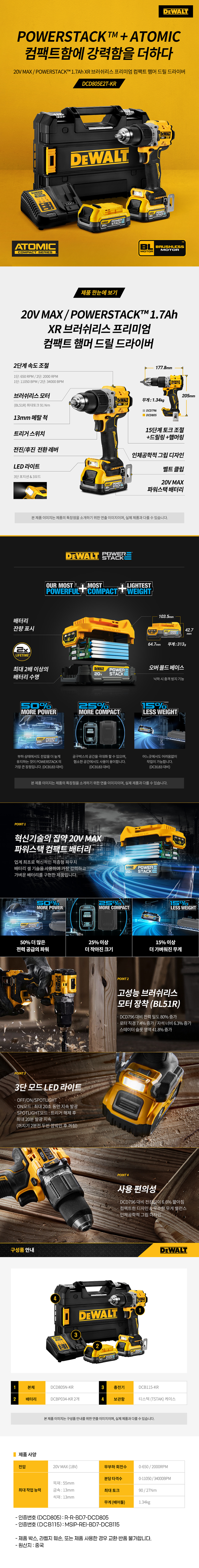 디월트 DCD805E2T 충전 파워스택 브러쉬리스 프리미엄 컴팩트 햄머 드릴 드라이버 20V 18V 1.7Ah