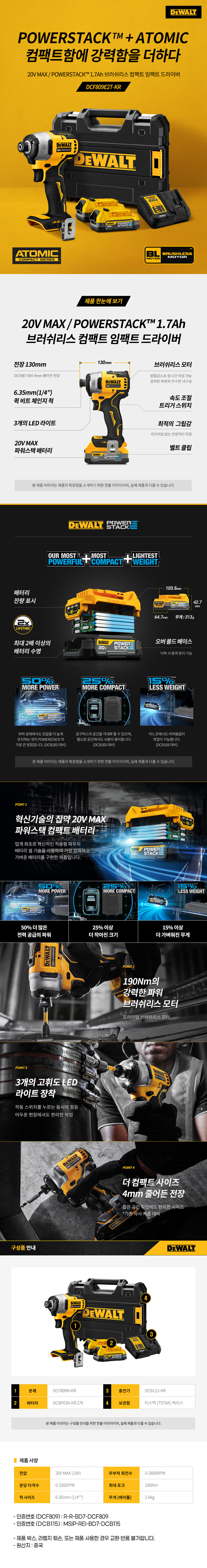 디월트 DCF809E2T 충전 파워스택 브러쉬리스 컴팩트 임팩트 드라이버 20V 18V 1.7Ah
