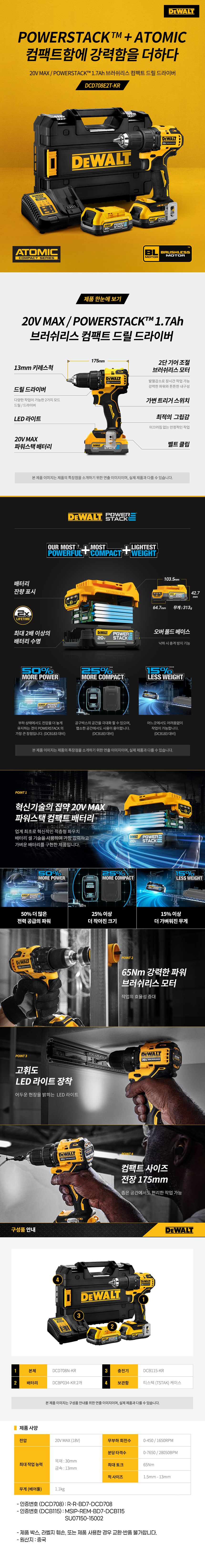 디월트 DCD708E2T 충전 파워스택 컴팩트 드릴 드라이버 20V 18V 1.7Ah