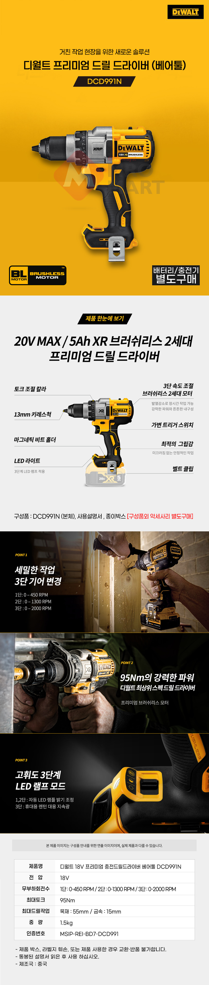 디월트 DCD991N 충전 20V 프리미엄 드릴 드라이버 베어툴