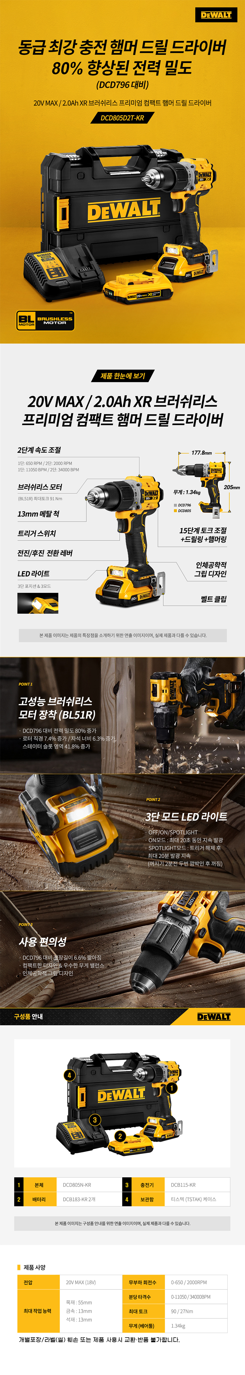 디월트 18V 20V XR 2.0Ah XR 브러쉬리스 프리미엄 컴팩트 햄머 드릴 드라이버 DCD805D2T