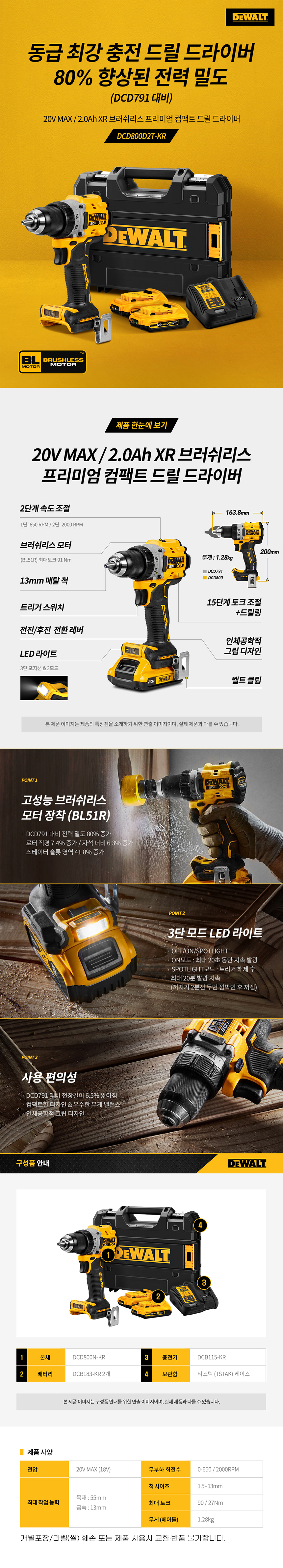 디월트 18V 20V 2.0Ah XR 브러쉬리스 프리미엄 컴팩트 드릴 드라이버 DCD800D2T