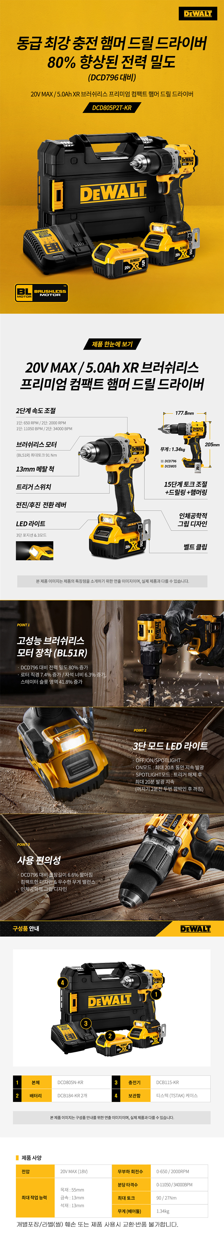 디월트 18V 20V 5.0Ah XR 브러쉬리스 프리미엄 컴팩트 햄머 드릴 드라이버 DCD805P2T