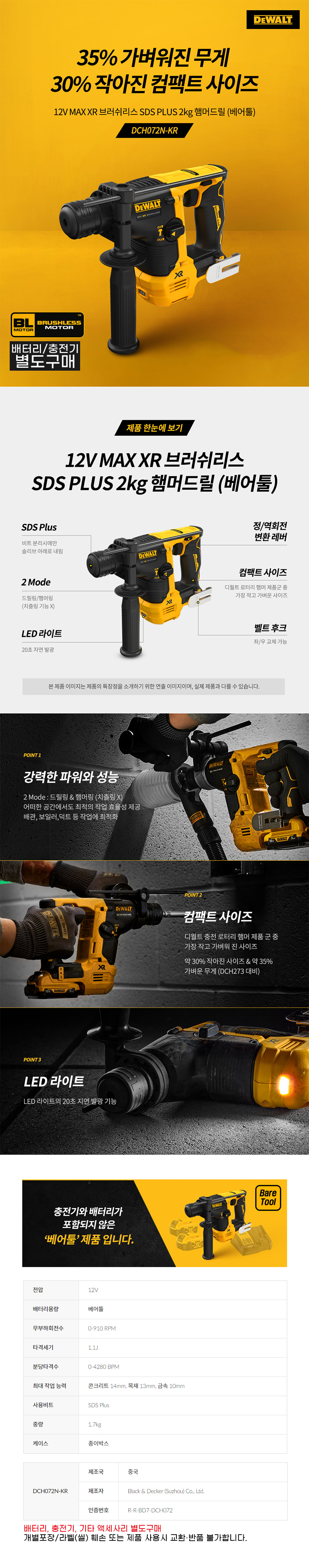 디월트 10.8V 12V XR 브러쉬리스 SDS PLUS 2kg 햄머 드릴 베어툴 DCH072N