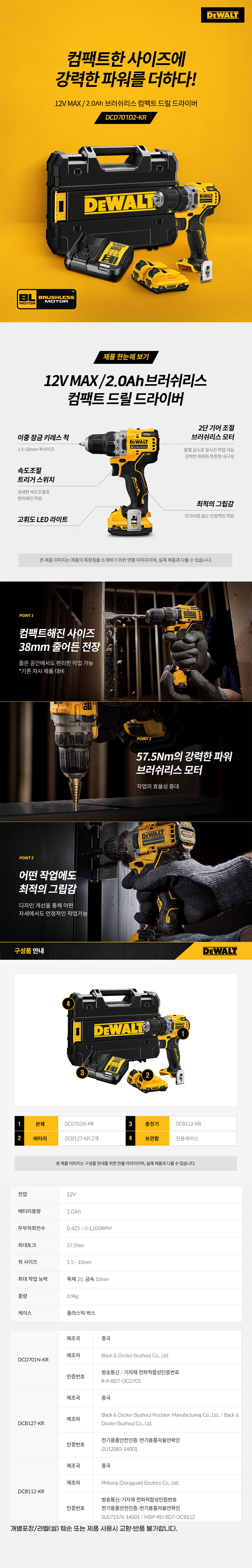 디월트 10.8V 12V 2.0Ah 브러쉬리스 컴팩트 드릴 드라이버 세트 DCD701D2