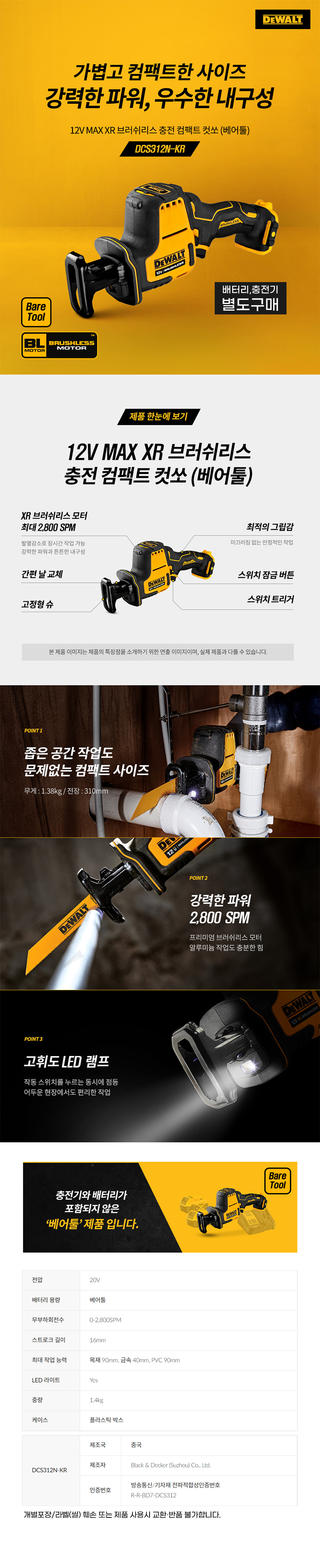 디월트 10.8V XR 브러쉬리스 충전 컴팩트 컷쏘 DCS312N 전기톱 컷소 목공 목재 절단