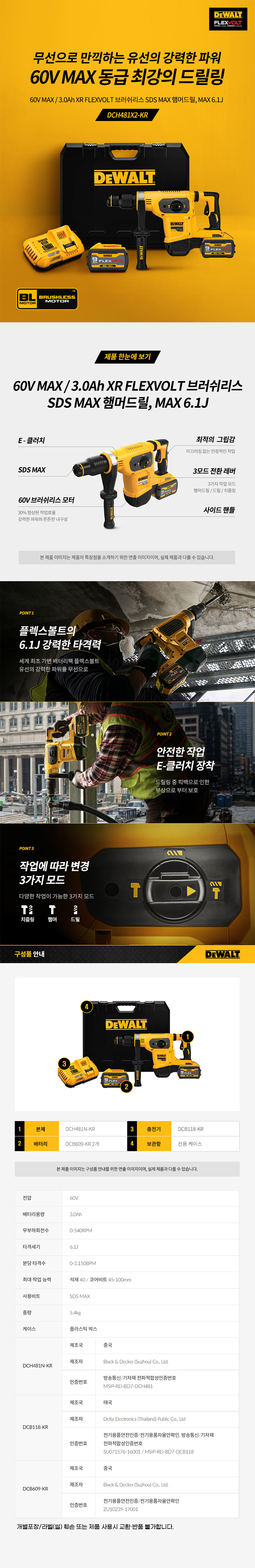 디월트 54V FLEXVOLT XR 브러쉬리스 충전 햄머 드릴 3.0ah 세트 SDS MAX DCH481X2