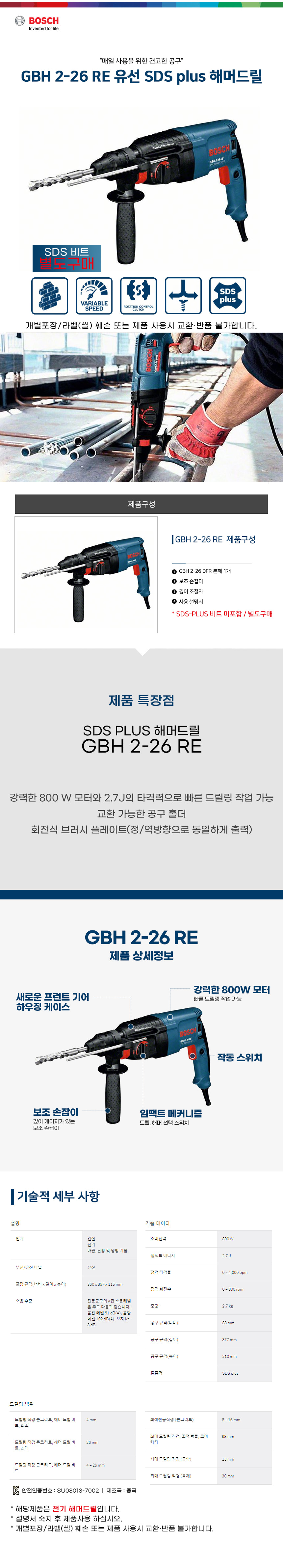 보쉬 GBH 2-26 RE 유선 SDS plus 해머 드릴 0611251398
