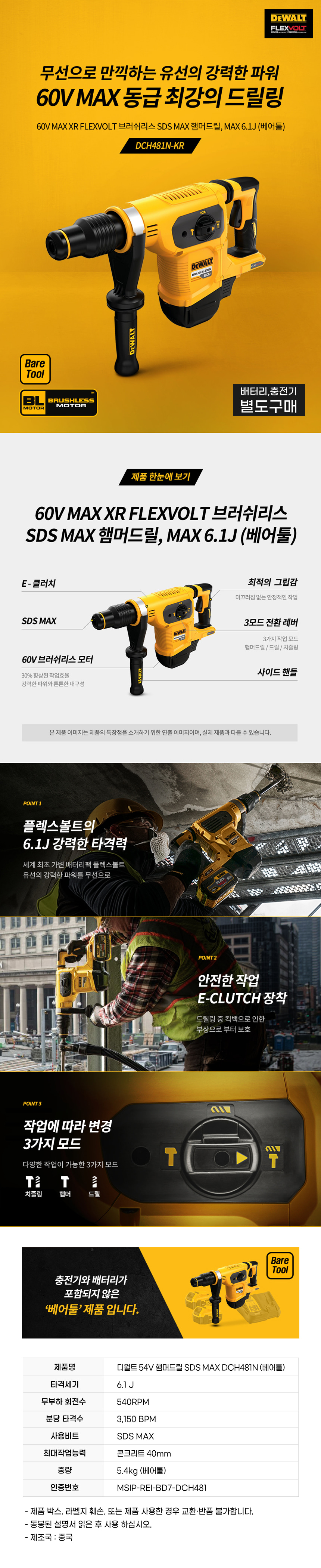 디월트 DCH481N 충전 플렉스볼트 햄머 드릴 베어툴 54V