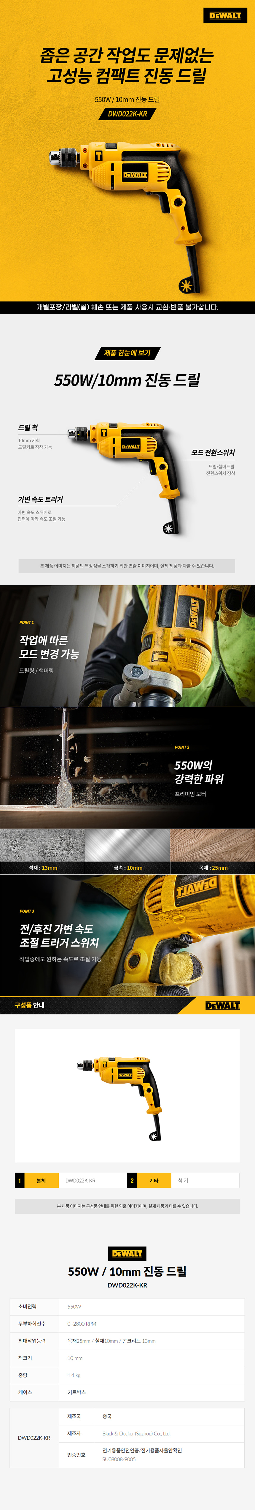디월트 DWD022K 유선 전기 진동 임팩트 드릴 햄머 해머 함마 10mm