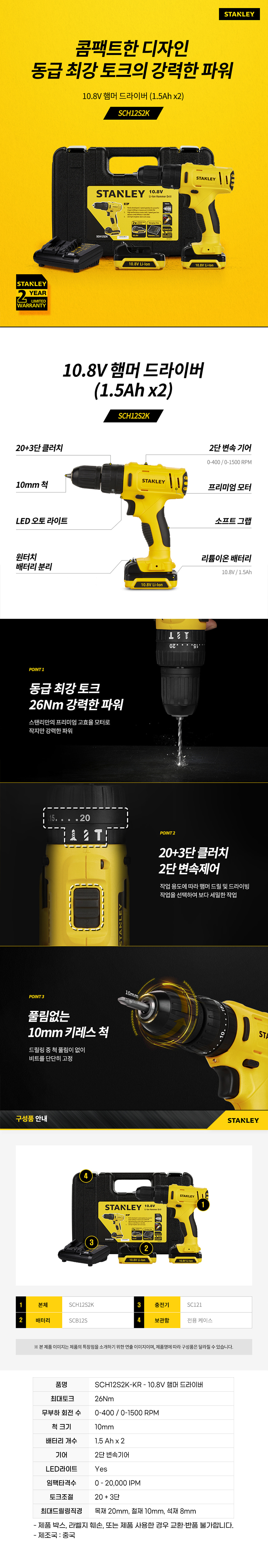 스탠리 10.8V 충전 햄머 드라이버 배터리 세트 SCH12S2K