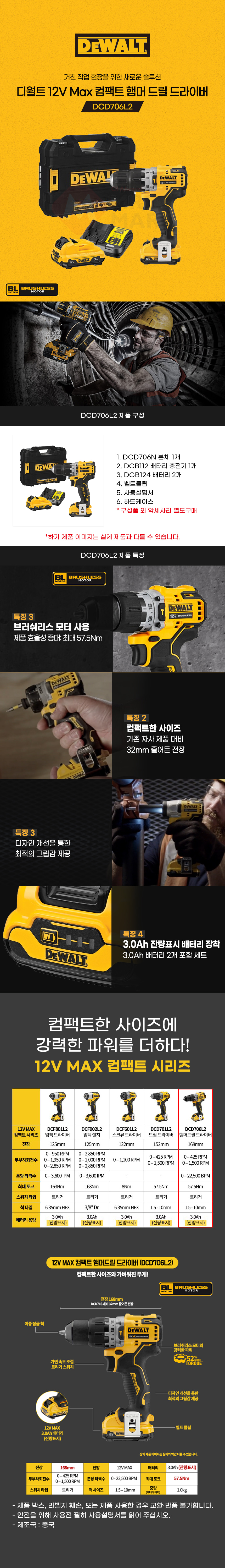 디월트 12V Max BL 컴팩트 햄머 드릴 드라이버 세트 DCD706L2
