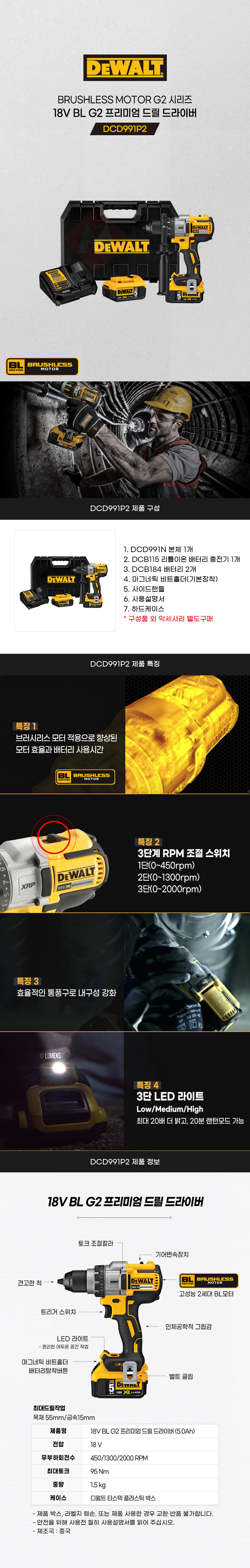디월트 18V BL G2 프리미엄 드릴 드라이버 세트 DCD991P2