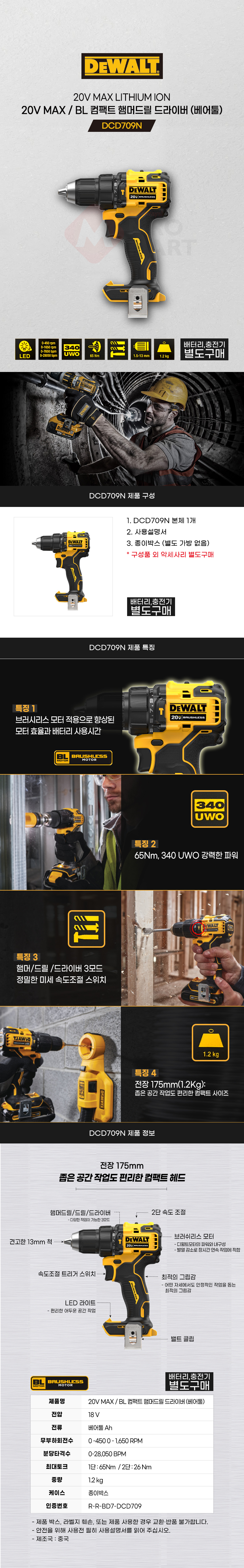 디월트 20V 18V MAX BL 컴팩트 햄머드릴 드라이버 베어툴 DCD709N