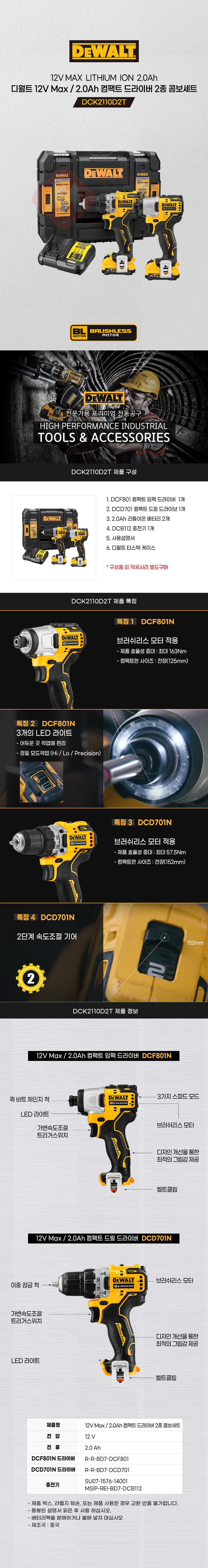 디월트 12V Max 2.0Ah 컴팩트 드라이버 2종 콤보세트 DCK2110D2T