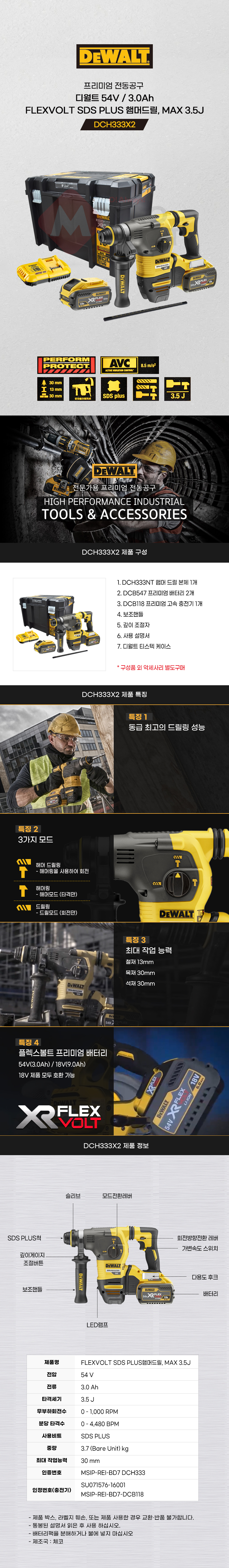 디월트 54V 3.0Ah 플렉스볼트 SDS PLUS 충전 햄머 드릴 DCH333X2