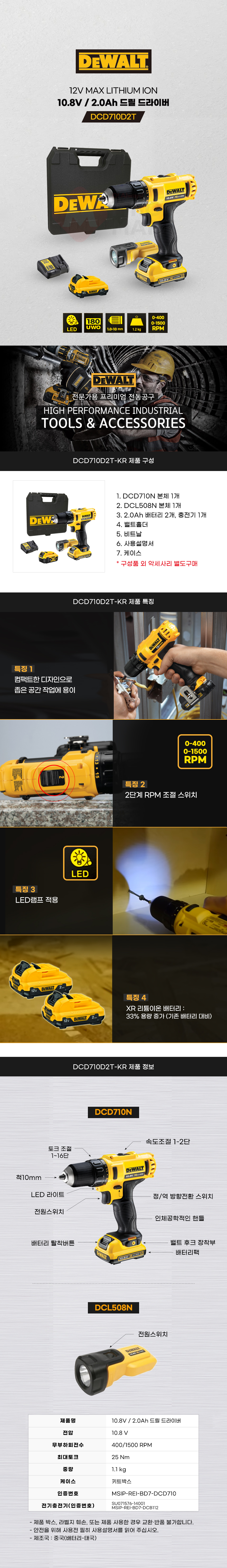 디월트 10.8V 2.0Ah 충전 드릴 드라이버 작업등 포함 DCD710D2T