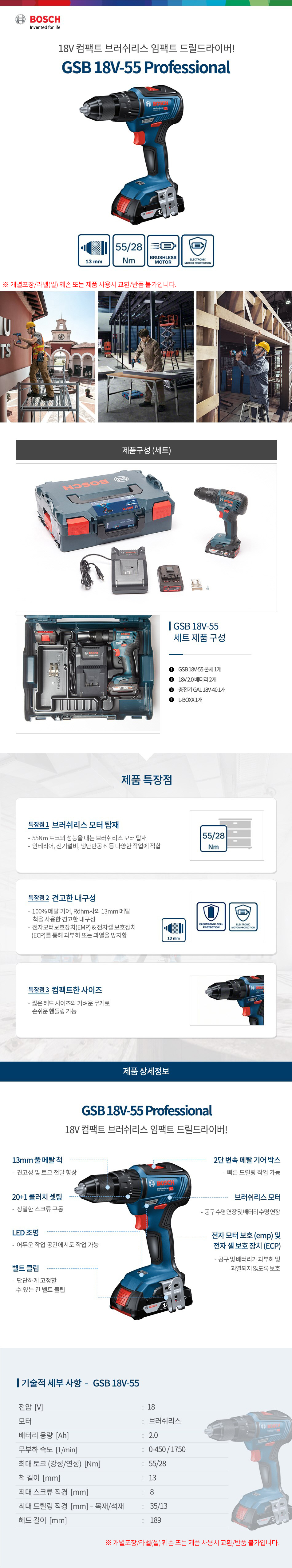 보쉬 GSB 18V-55 충전드릴드라이버 배터리 세트 06019H53B2