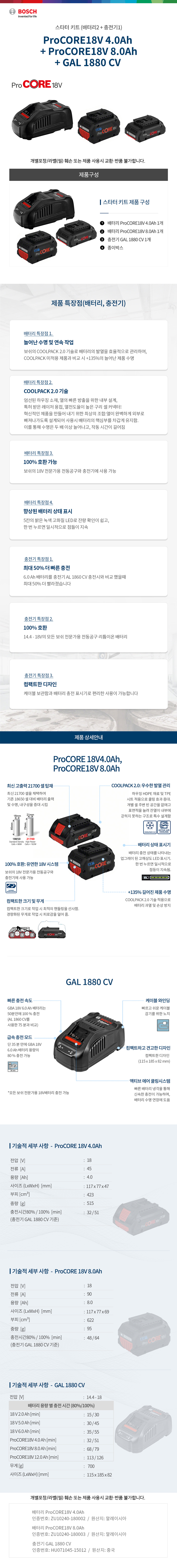 보쉬 스타터 키트 ProCORE18V 4.0+8.0Ah+GAL 1880 CV 배터리 충전기 세트 1600A020N7