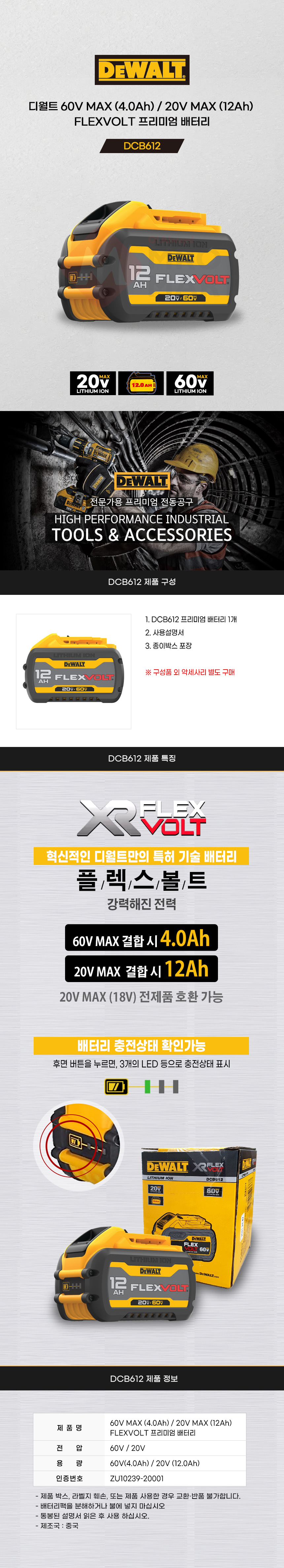 디월트 60V 4.0Ah 20V 12Ah 플렉스볼트 프리미엄 배터리 DCB612