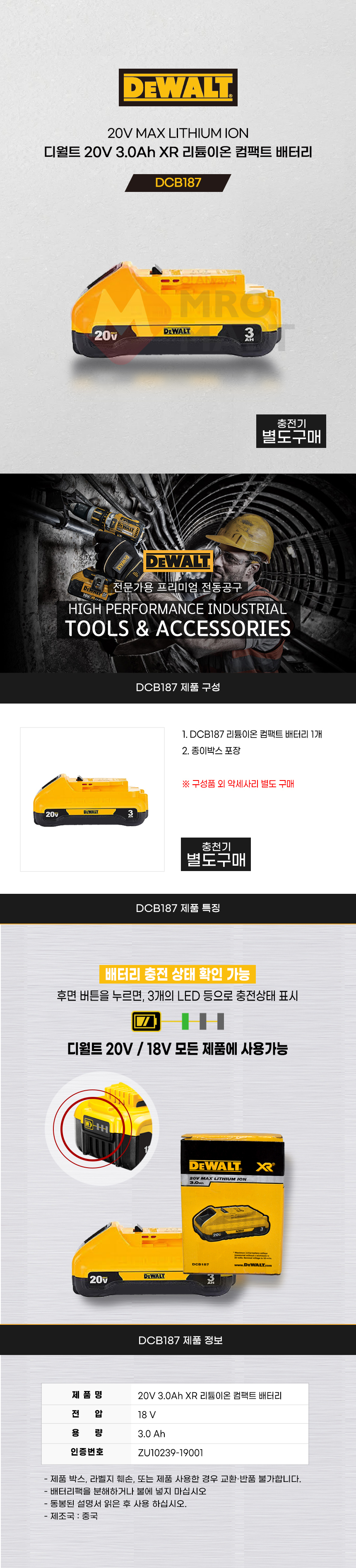디월트 20V 3.0Ah XR 리튬이온 컴팩트 배터리 DCB187