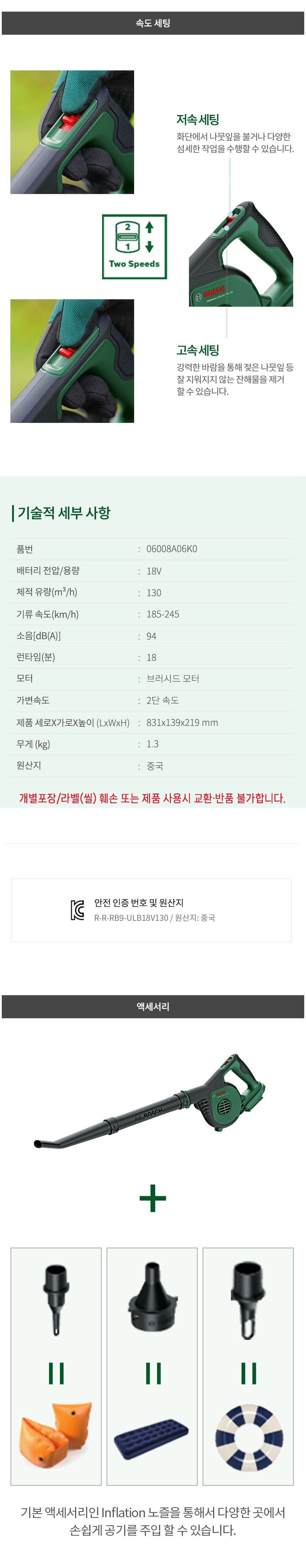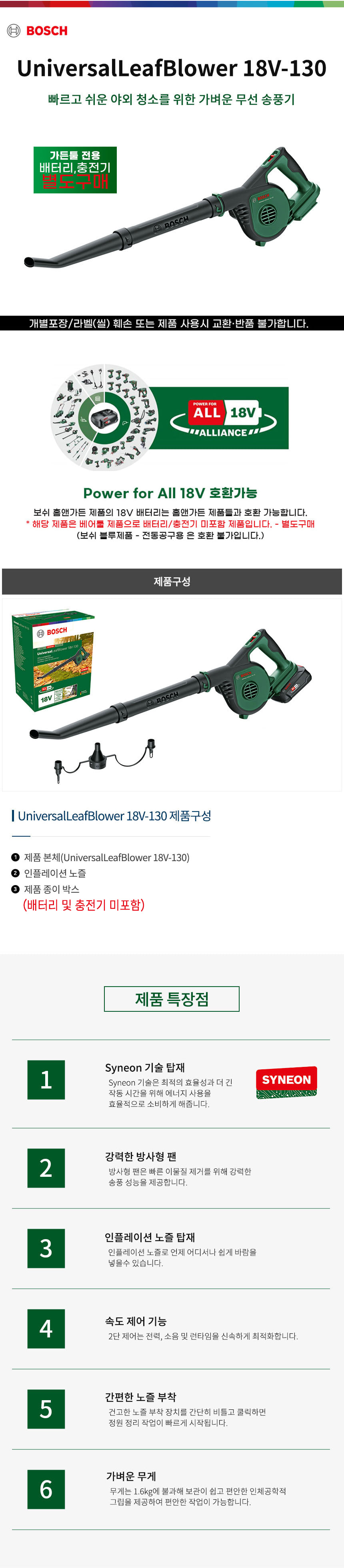 보쉬 가든툴 UniversalLeafBlower 18V-130 충전 송풍기 베어툴 06008A06K0 블로워 브러워 세차 낙엽 눈 청소