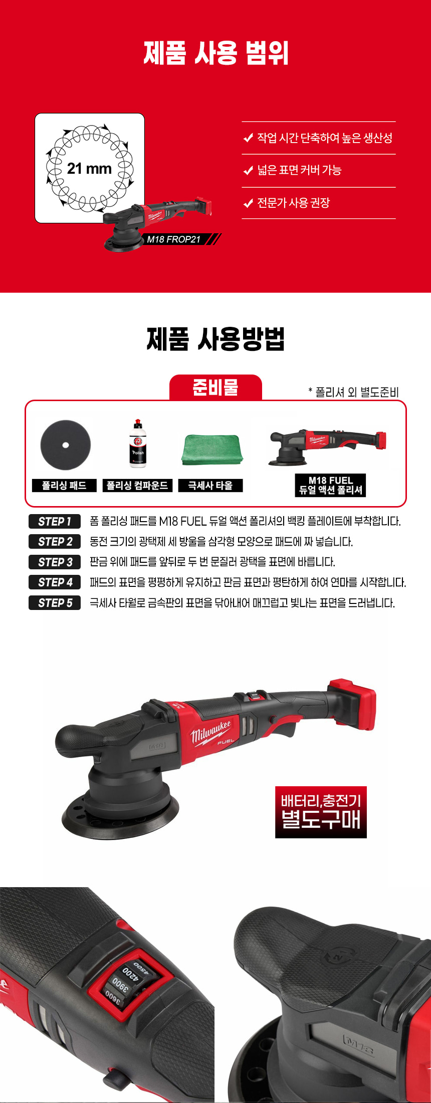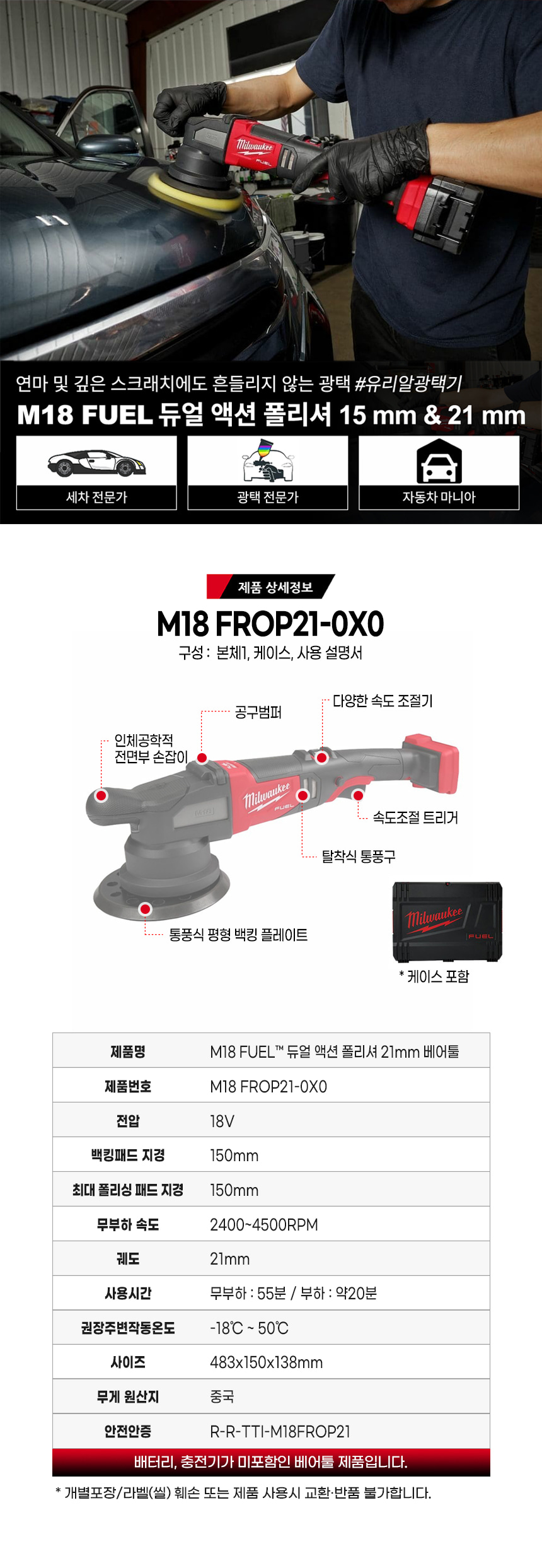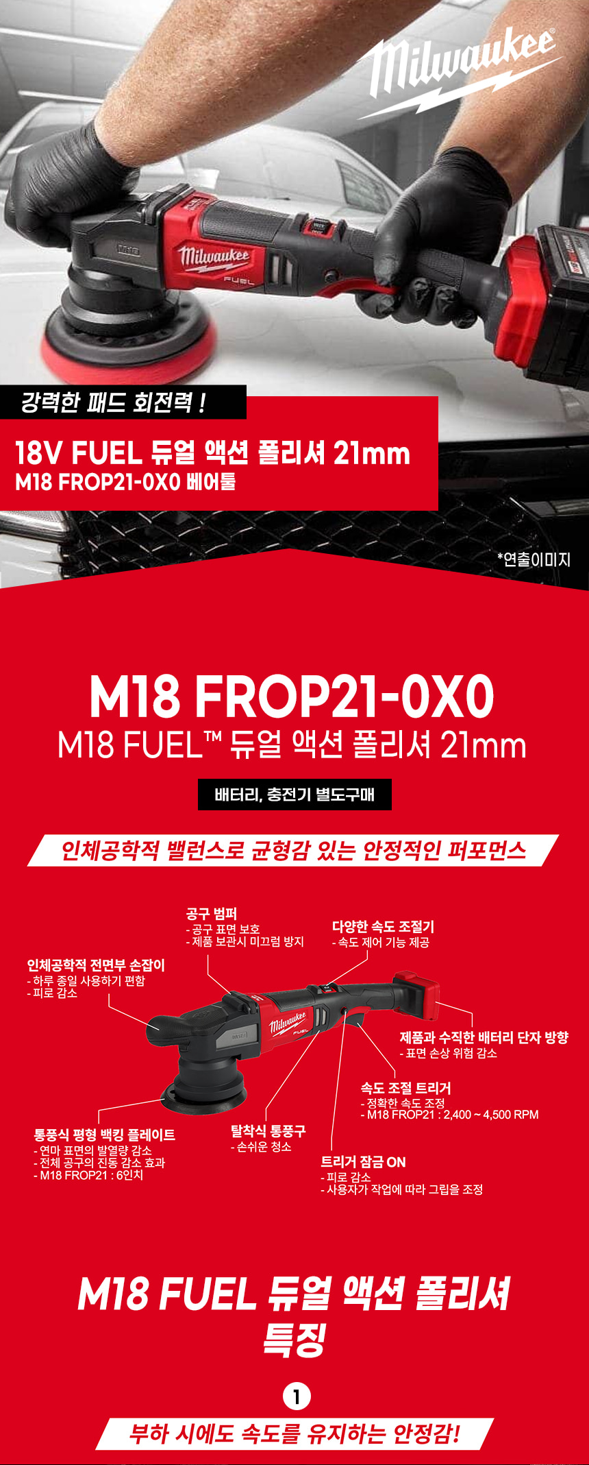 밀워키 18V FUEL 듀얼 액션 충전 폴리셔 베어툴 21mm M18 FROP21-0X0 광택기 도장 광택 연마