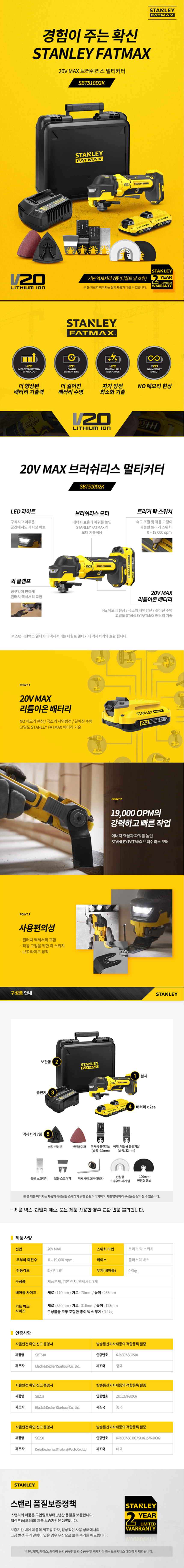 스탠리 SBT510D2K 충전 브러쉬리스 멀티커터 20V 2.0Ah 액세서리 7종포함