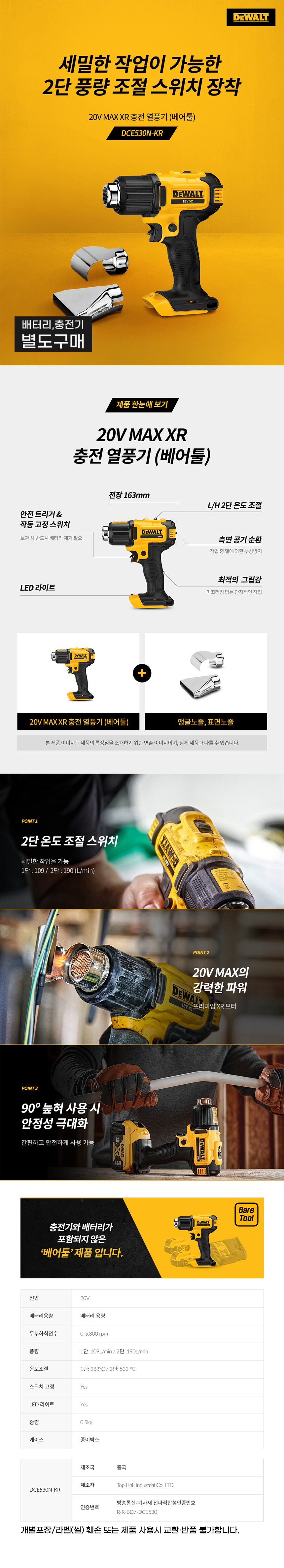 디월트 18V 20V 충전 열풍기 베어툴 DCE530N 히팅건 핫건 2단 조절
