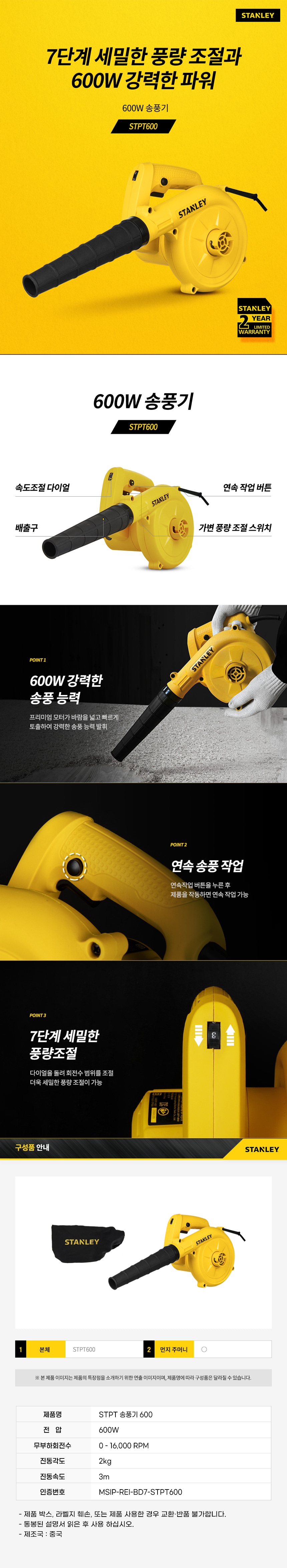 스탠리 STPT600 송풍기 600W 유선먼지 블로워 낙엽 청소 세차 강력 청소기