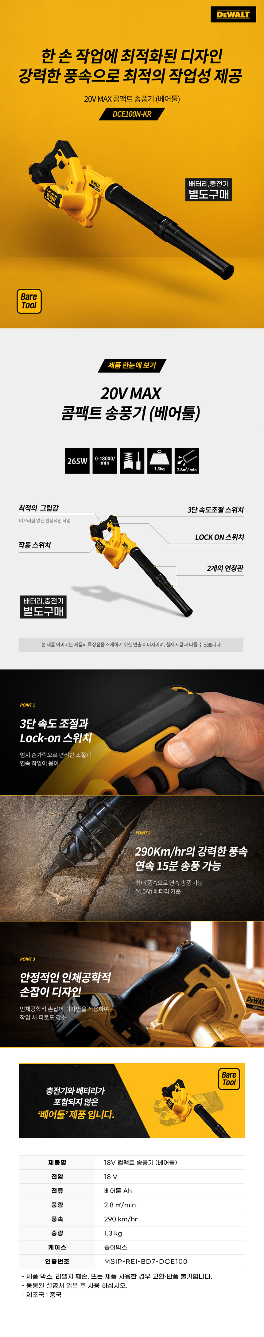 디월트 18V 컴팩트 송풍기 베어툴 배터리 미포함 DCE100N