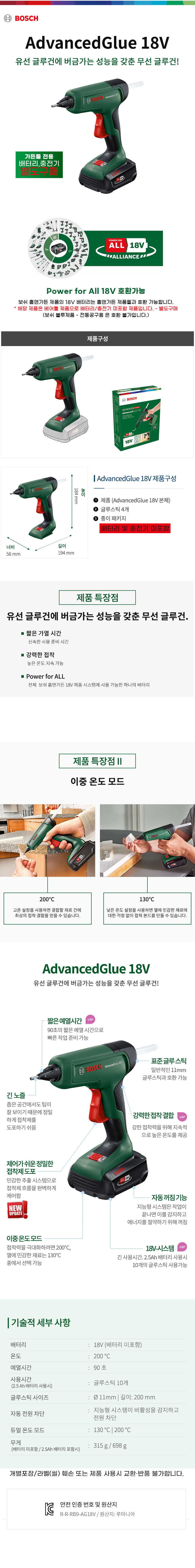 보쉬 AdvancedGlue 18V 충전 핫 글루건 베어툴 0603264850 핫멜트건 본드총 핫멜트 접착제