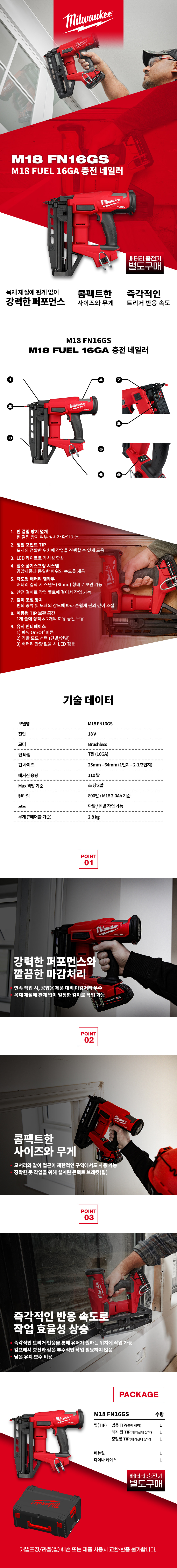 밀워키 18V FUEL 16GA 충전 네일러 베어툴 M18 FN16GS-0X0