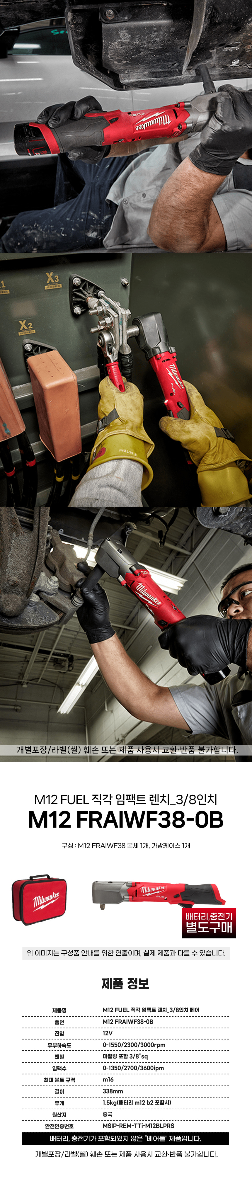 밀워키 12V FUEL 충전 직각 임팩트 렌치 3/8인치 베어툴 M12 FRAIWF38-0B