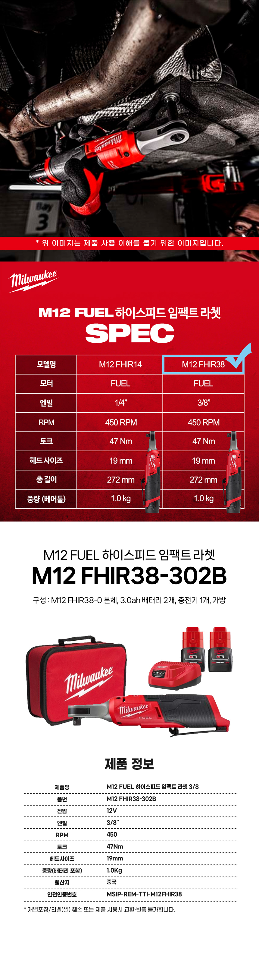 밀워키 12V FUEL 충전 하이스피드 임팩트 라쳇 3/8인치 배터리 세트 M12 FHIR38-302B