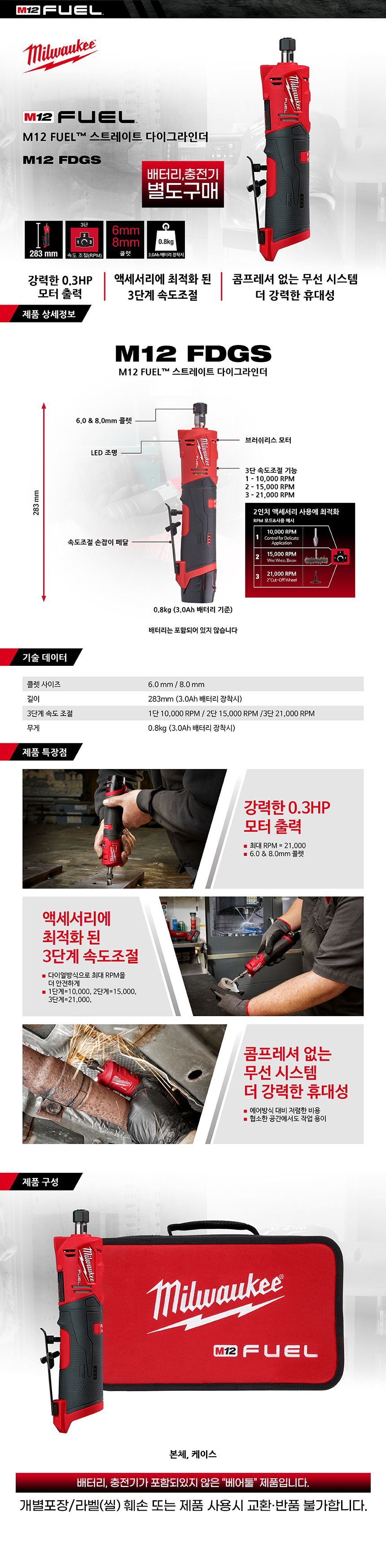 밀워키 12V FUEL 충전 스트레이트 다이 그라인더 베어툴 M12 FDGS-0B 에어 공구 샌딩 일자형