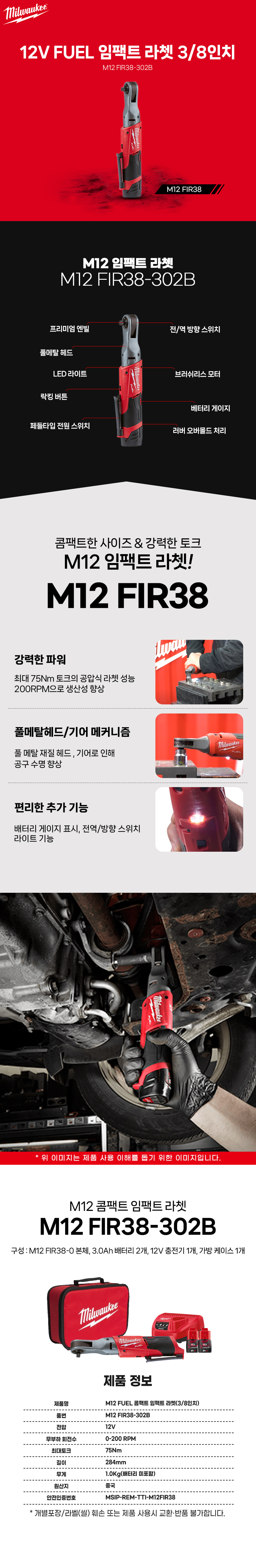 밀워키 12V 3.0Ah FUEL 충전 콤팩트 임팩트 라쳇 배터리 세트 3/8인치 M12 FIR38-302B