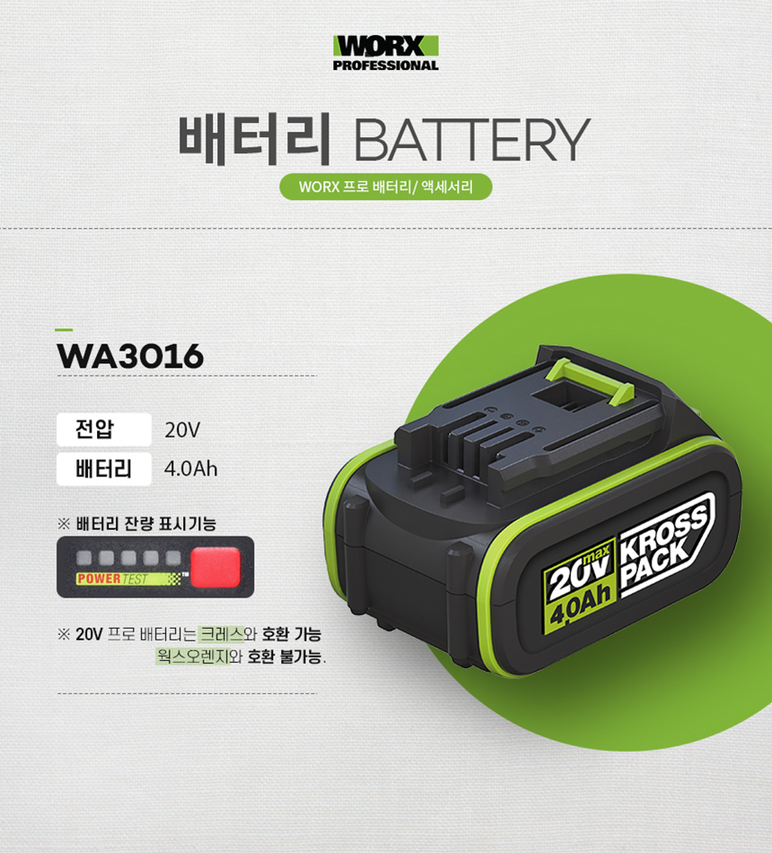 웍스 프로 WA3016 충전 20V 4.0Ah 전동공구 리튬이온 배터리 밧데리 크레스 호환