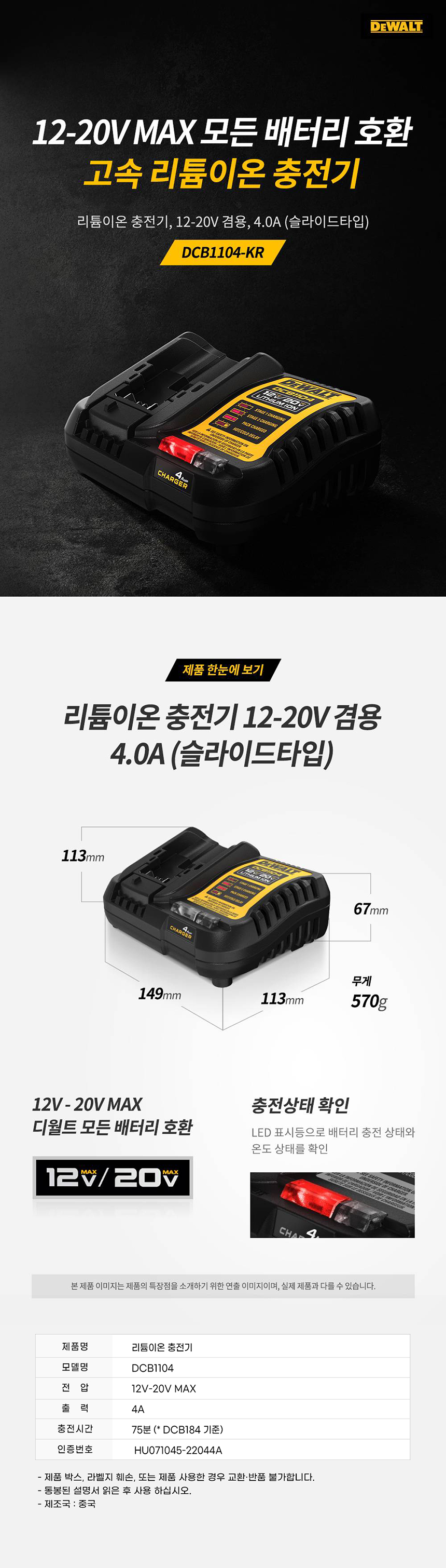 디월트 DCB1104 리튬이온 배터리 충전기 12-20V 겸용